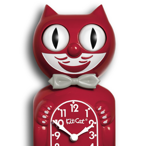 This is the Limited Edition Kit-Cat Clock in Game Day Scarlet Red, with his trademark bowtie, inquisitive eyes that scan side to side and a wagging pendulum tail.