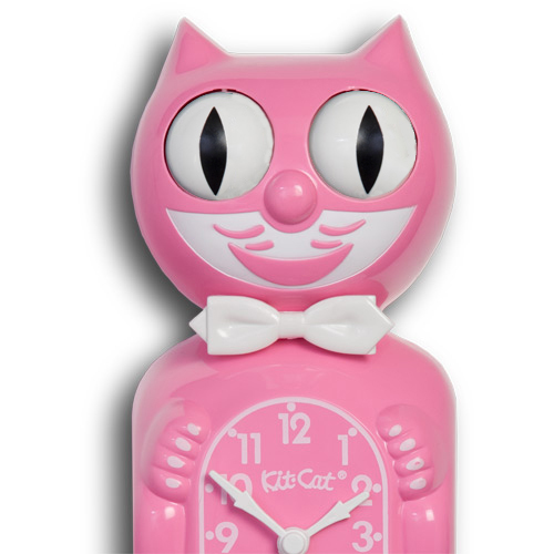 This is the Limited Edition Kit-Cat Clock in Flamingo Pink, with his trademark bowtie, inquisitive eyes that scan side to side and a wagging pendulum tail.