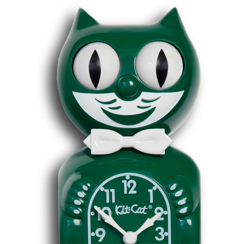 This is the Limited Edition Kit-Cat Clock in Hunter Green, with his trademark bowtie, inquisitive eyes that scan side to side and a wagging pendulum tail.