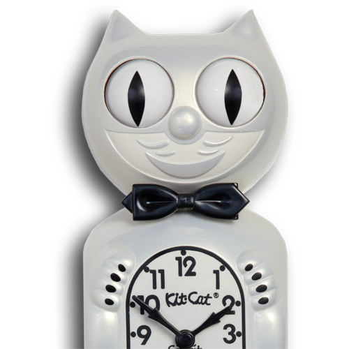 This is the Limited Edition Spirit of ’76 Kit-Cat Clock in Metallic White, with his trademark bowtie, inquisitive eyes that scan side to side and a wagging pendulum tail.