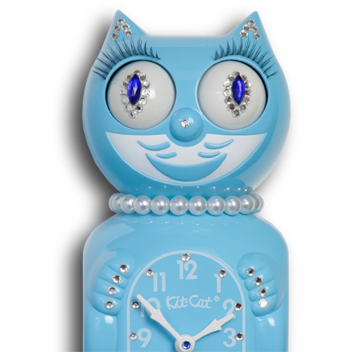 This is the Limited Edition Jeweled Lady Kit-Cat Clock in Sky Blue, with pearls, long, luxurious lashes, and the same inquisitive eyes that scan side to side and a wagging pendulum tail her tomcat has, and encrusted with Swarovski crystals.