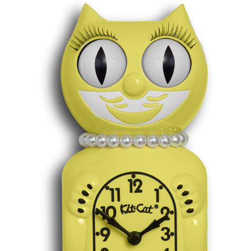 This is the Limited Edition Sunshine Yellow Lady Kit-Cat Clock, with pearls, long, luxurious lashes, and the same inquisitive eyes that scan side to side and a wagging pendulum tail her tomcat has.