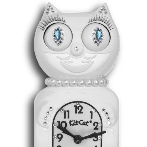 This is the Limited Edition and now discontinued Jewelled White Lady Kit-Cat Clock, with pearls, long, luxurious lashes, and the same inquisitive eyes that scan side to side and a wagging pendulum tail her tomcat has.