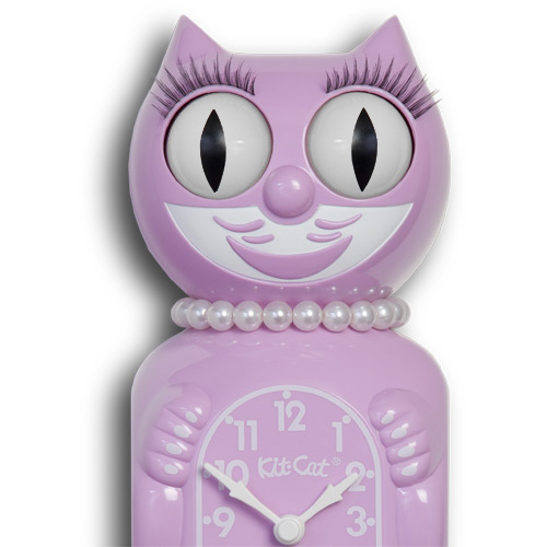 This is the Limited Edition Lady Kit-Cat Clock in Wisteria Pink, with pearls, long, luxurious lashes, and the same inquisitive eyes that scan side to side and a wagging pendulum tail her tomcat has.