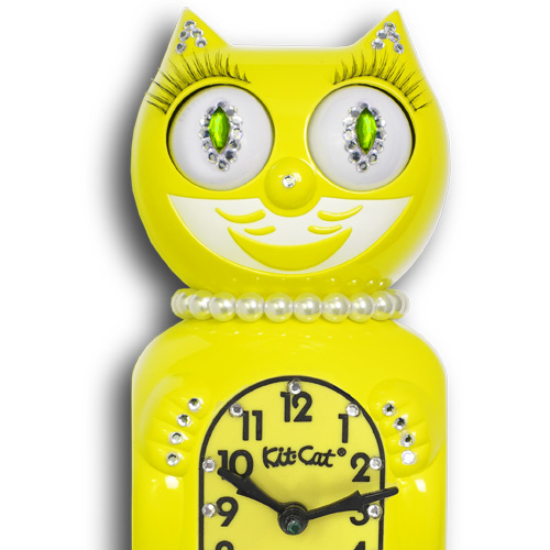 This is the Limited Edition and now discontinued Sunshine Yellow Lady JBC-19 Kit-Cat Clock, with pearls, long, luxurious lashes, and the same inquisitive eyes that scan side to side and a wagging pendulum tail her tomcat has, and encrusted with Swarovski crystals.