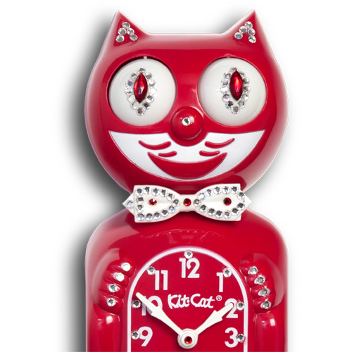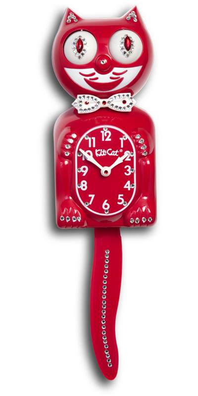 This is the Limited Edition Jeweled Kit-Cat Clock in Cranberry Red, with his trademark bowtie, inquisitive eyes that scan side to side and a wagging pendulum tail, and encrusted with Swarovski crystals.